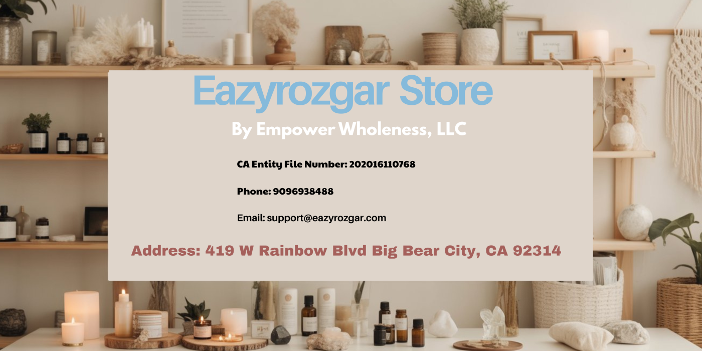 At Eazyrozgar by Empower Wholeness, LLC, we’re more than just a shop—we’re a space dedicated to balance, intention, and mindful living. We believe well-being should feel natural and approachable, guided by thoughtful choices, honest craftsmanship, and supportive service whenever you need it.